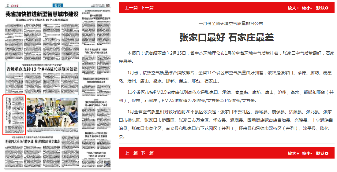 1月份,按照空气质量综合指数排名,全省11个设区市空气质量由好到差,依次是张家口、承德、廊坊、秦皇岛、沧州、唐山、衡水、邯郸、保定、邢台、石家庄。