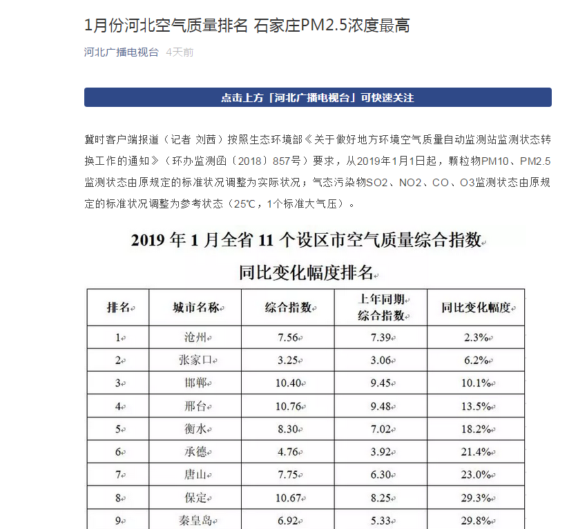 河北广播电视台微信:1月份河北空气质量排名 石家庄PM2.5浓度最高
