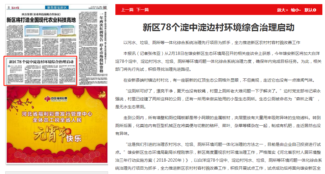 “这是我们引进的治理农村污水、垃圾、厕所环境问题一体化治理的方法之一,目前是由企业自己投资进行试点。”雄安新区生态环境局副局长程刚表示,新区高度重视农村环境治理工作,严格落实《河北省农村人居环境整治三年行动实施方案(2018-2020年)》,以白洋淀78个淀中、淀边村污水、垃圾、厕所等环境问题一体化综合系统治理先行项目为抓手,全力推进新区农村村容村貌改善工作,积极开展试点工作,试点成功后将面向雄安新区全域农村推广,提升农村环境治理水平。