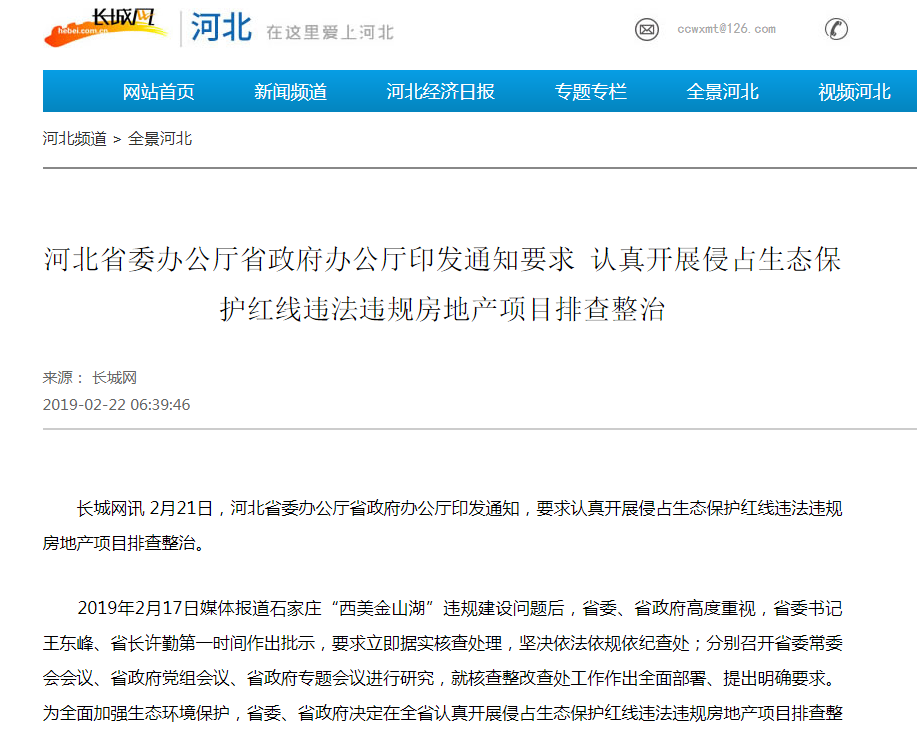 长城网讯 2月21日,河北省委办公厅省政府办公厅印发通知,要求认真开展侵占生态保护红线违法违规房地产项目排查整治。