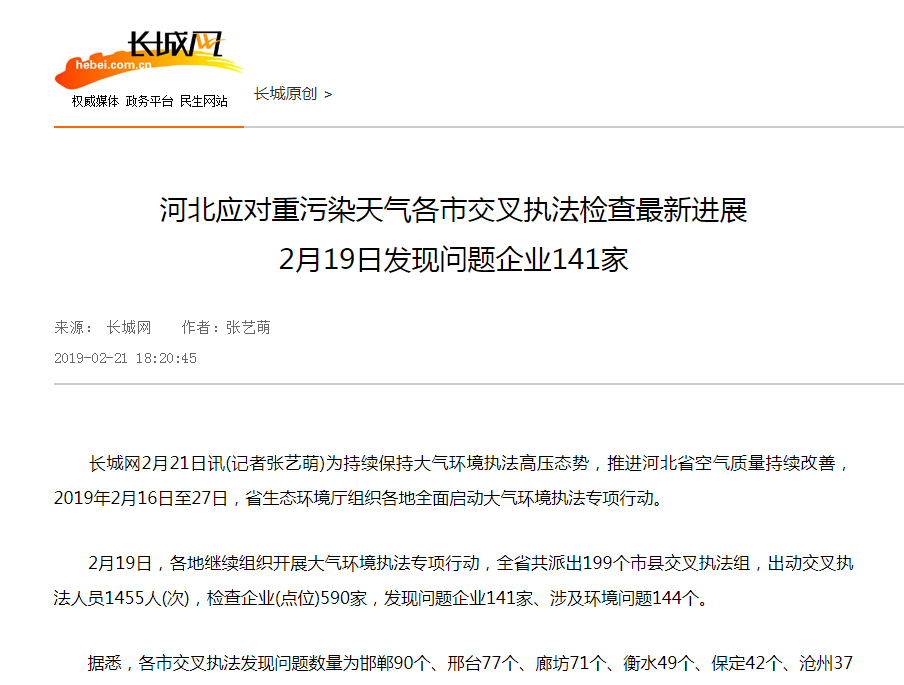 长城网2月21日讯(记者张艺萌)为持续保持大气环境执法高压态势,推进河北省空气质量持续改善,2019年2月16日至27日,东京热 组织各地全面启动大气环境执法专项行动。