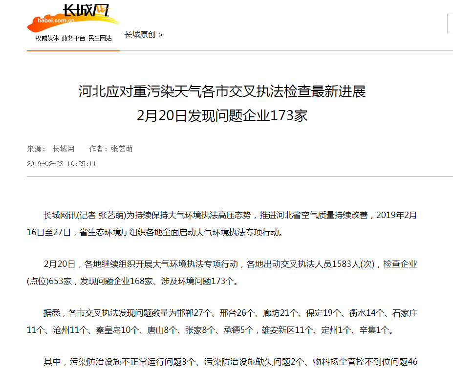 2月20日,各地继续组织开展大气环境执法专项行动,各地出动交叉执法人员1583人(次),检查企业(点位)653家,发现问题企业168家、涉及环境问题173个。