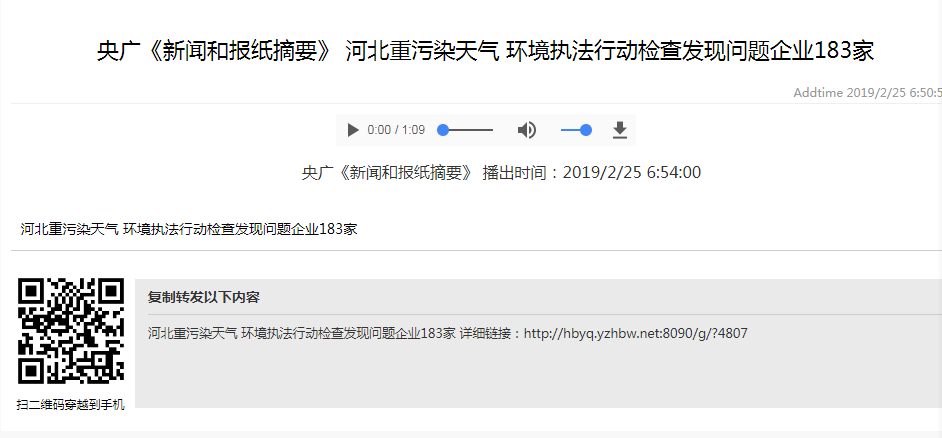 央广《新闻和报纸摘要》:河北重污染天气 环境执法行动检查发现问题企业183家