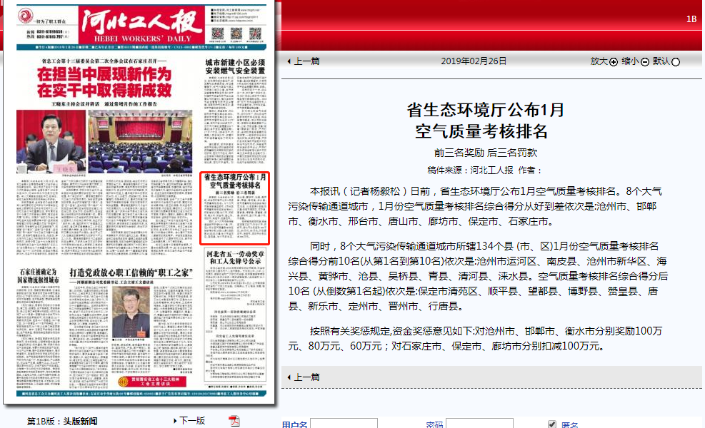 同时,8个大气污染传输通道城市所辖134个县 (市、区)1月份空气质量考核排名综合得分前10名(从第1名到第10名)依次是:沧州市运河区、南皮县、沧州市新华区、海兴县、黄骅市、沧县、吴桥县、青县、清河县、涞水县。空气质量考核排名综合得分后10名 (从倒数第1名起)依次是:保定市清苑区、顺平县、望都县、博野县、赞皇县、唐县、新乐市、定州市、晋州市、行唐县。