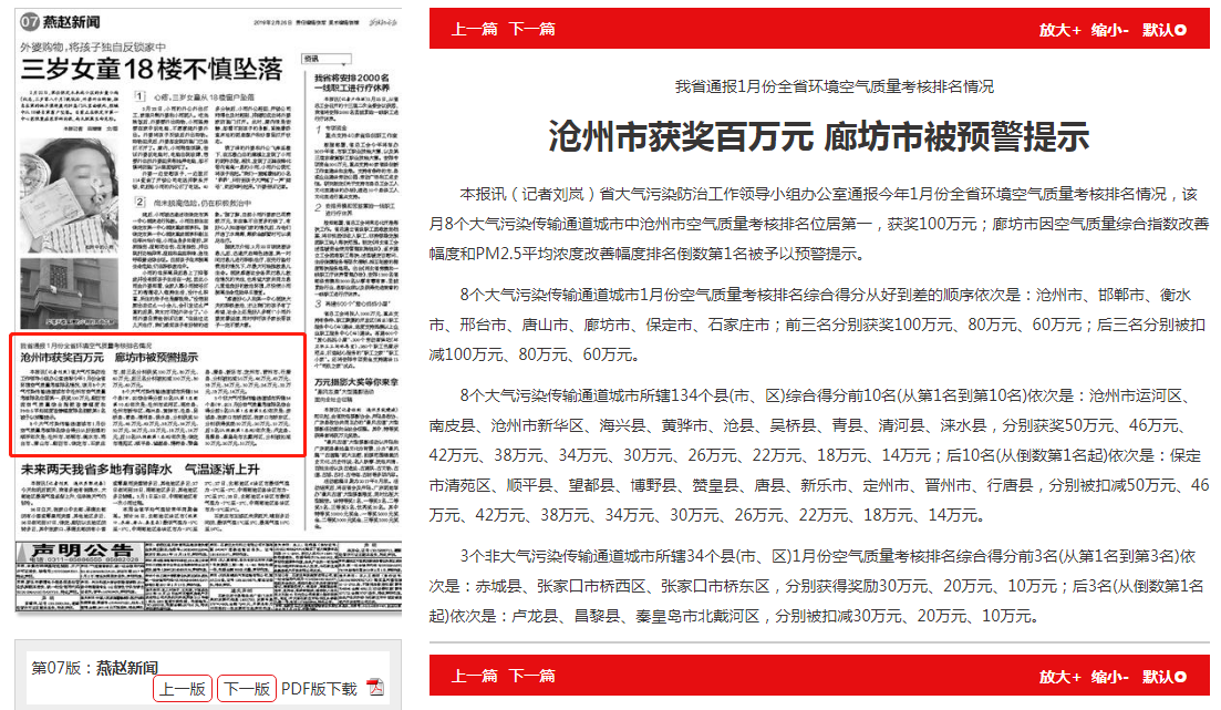 8个大气污染传输通道城市所辖134个县(市、区)综合得分前10名(从第1名到第10名)依次是:沧州市运河区、南皮县、沧州市新华区、海兴县、黄骅市、沧县、吴桥县、青县、清河县、涞水县,分别获奖50万元、46万元、42万元、38万元、34万元、30万元、26万元、22万元、18万元、14万元;后10名(从倒数第1名起)依次是:保定市清苑区、顺平县、望都县、博野县、赞皇县、唐县、新乐市、定州市、晋州市、行唐县,分别被扣减50万元、46万元、42万元、38万元、34万元、30万元、26万元、22万元、18万元、14万元。