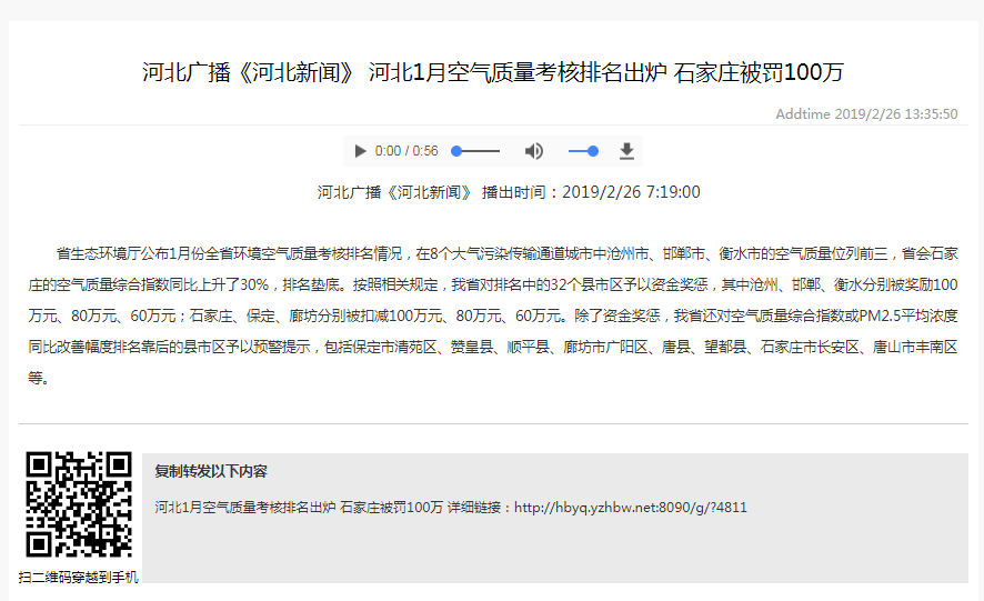 河北综合广播《河北新闻》:河北1月空气质量考核排名出炉 石家庄被罚100万