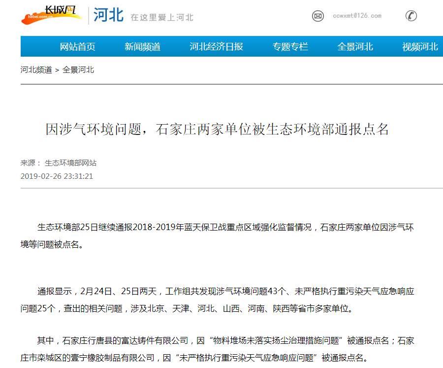 生态环境部25日继续通报2018-2019年蓝天保卫战重点区域强化监督情况,石家庄两家单位因涉气环境等问题被点名。