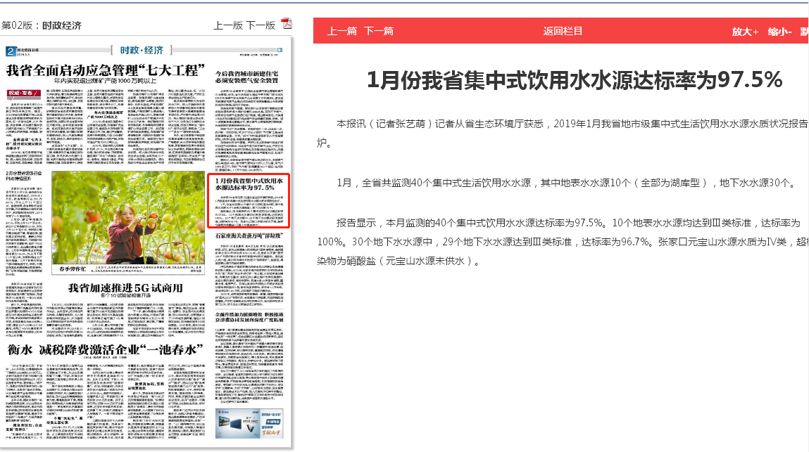 长城网:1月份我省集中式饮用水水源达标率为97.5% 来源:省生态环境宣传教育中心 时间:2019-03-05