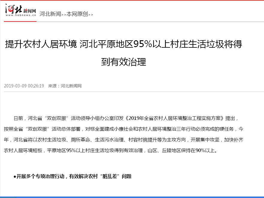 日前,河北省“双创双服”活动领导小组办公室印发《2019年全省农村人居环境整治工程实施方案》提出,按照全省“双创双服”活动总体部署,对标全面建成小康社会和农村人居环境整治三年行动必须完成的硬任务,今年,河北省将以农村生活垃圾、厕所革命、生活污水治理、村容村貌提升等为主攻方向,开展集中攻坚,加快补齐农村人居环境短板,平原地区95%以上村庄生活垃圾得到有效治理,山区、丘陵地区保持在90%以上。