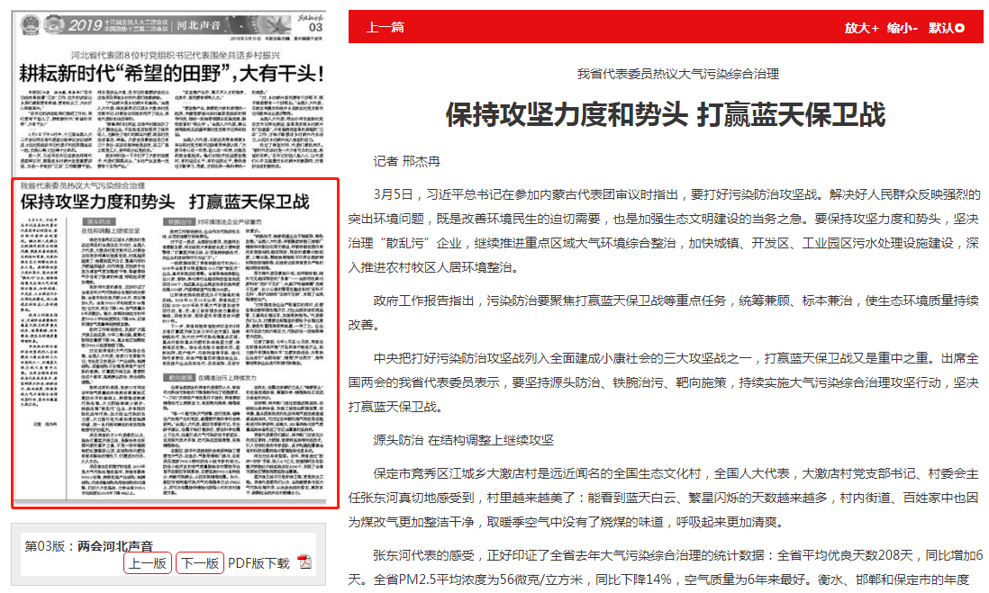 张东河代表的感受,正好印证了全省去年大气污染综合治理的统计数据:全省平均优良天数208天,同比增加6天。全省PM2.5平均浓度为56微克/立方米,同比下降14%,空气质量为6年来最好。衡水、邯郸和保定市的年度PM2.5平均浓度同比下降20%,区域环境空气质量得到持续改善。