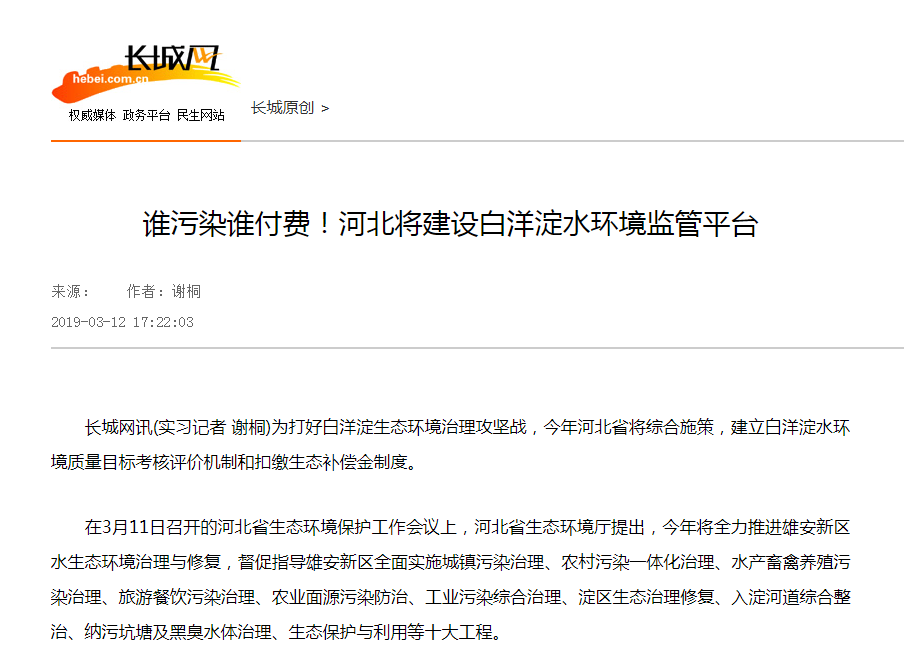 长城网讯(实习记者 谢桐)为打好白洋淀生态环境治理攻坚战,今年河北省将综合施策,建立白洋淀水环境质量目标考核评价机制和扣缴生态补偿金制度。