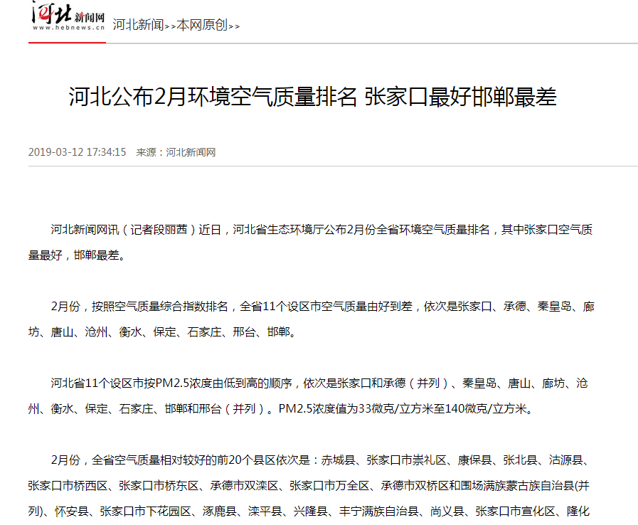2月份,按照空气质量综合指数排名,全省11个设区市空气质量由好到差,依次是张家口、承德、秦皇岛、廊坊、唐山、沧州、衡水、保定、石家庄、邢台、邯郸。