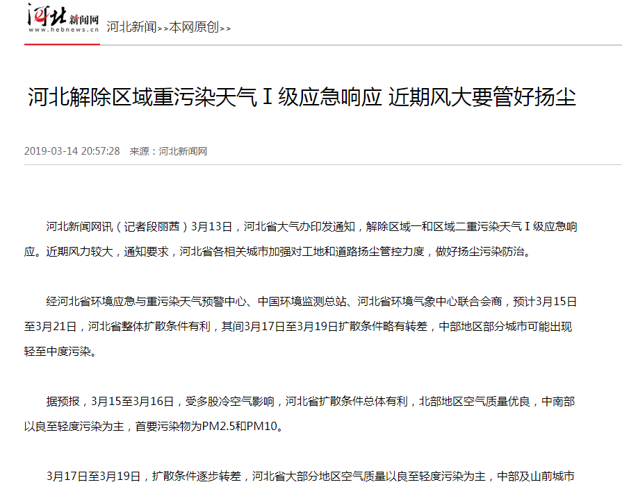 河北新闻网讯(记者段丽茜)3月13日,河北省大气办印发通知,解除区域一和区域二重污染天气Ⅰ级应急响应。近期风力较大,通知要求,河北省各相关城市加强对工地和道路扬尘管控力度,做好扬尘污染防治。