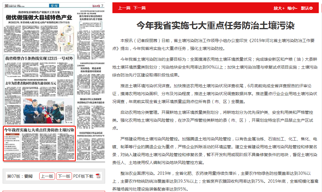 本报讯(记者段丽茜)日前,省土壤污染防治工作领导小组办公室印发《2019年河北省土壤污染防治工作要点》提出,今年我省将实施七大重点任务,强化土壤污染防控。