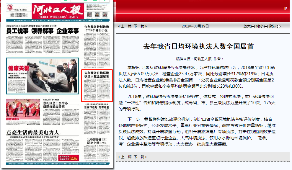 本报讯 记者从省环境综合执法局获悉,为严打环境违法行为,2018年全省共出动执法人员65.09万人次,检查企业23.47万家次,同比分别增长317%和219%;日均执法人数、日均检查企业数持续排名全国第一;处罚企业数量和罚款金额分别居全国第2位和第3位,罚款金额和个案平均处罚金额同比分别增长23%和30%。