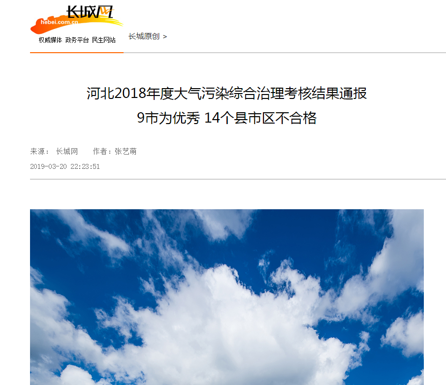 长城网3月20日讯(记者 张艺萌)日前河北省大气污染防治工作领导小组印发《关于2018年度全省大气污染综合治理考核结果的通报》,9市大气污染综合治理工作考核为优秀,14个县市区不合格。
