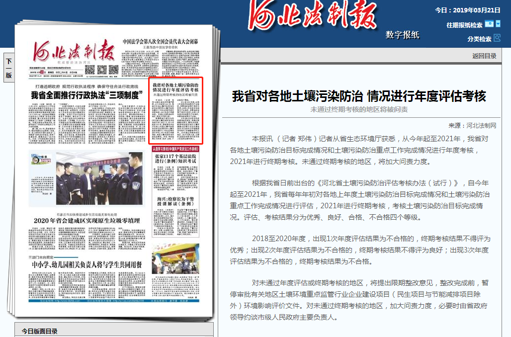 获悉,从今年起至2021年,我省对各地土壤污染防治目标完成情况和土壤污染防治重点工作完成情况进行年度考核,2021年进行终期考核。未通过终期考核的地区,将加大问责力度。 根据我省日前出台的《河北省土壤污染防治评估考核办法(试行)》,自今年起至2021年,我省每年年初对各地上年度土壤污染防治目标完成情况和土壤污染防治重点工作完成情况进行评估,2021年进行终期考核,考核土壤污染防治目标完成情况。评估、考核结果分为优秀、良好、合格、不合格四个等级。 2018至2020年度,出现1次年度评估结果为不合格的,终期考核结果不得评为优秀;出现2次年度评估结果为不合格的,终期考核结果不得评为良好;出现3次年度评估结果为不合格的,终期考核结果为不合格。 对未通过年度评估或终期考核的地区,将提出限期整改意见,整改完成前,暂停审批有关地区土壤环境重点监管行业企业建设项目(民生项目与节能减排项目除外)环境影响评价文件。对未通过终期考核的地区,加大问责力度,必要时由省政府领导约谈市级人民政府主要负责人。