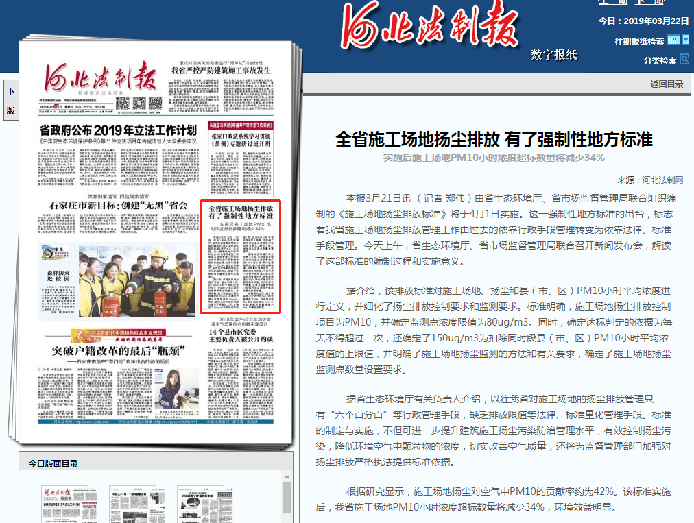 、省市场监督管理局联合召开新闻发布会,解读了这部标准的编制过程和实施意义。 据介绍,该排放标准对施工场地、扬尘和县(市、区)PM10小时平均浓度进行定义,并细化了扬尘排放控制要求和监测要求。标准明确,施工场地扬尘排放控制项目为PM10,并确定监测点浓度限值为80ug/m3。同时,确定达标判定的依据为每天不得超过二次,还确定了150ug/m3为扣除同时段县(市、区)PM10小时平均浓度值的上限值,并明确了施工场地扬尘监测的方法和有关要求,确定了施工场地扬尘监测点数量设置要求。 据东京热