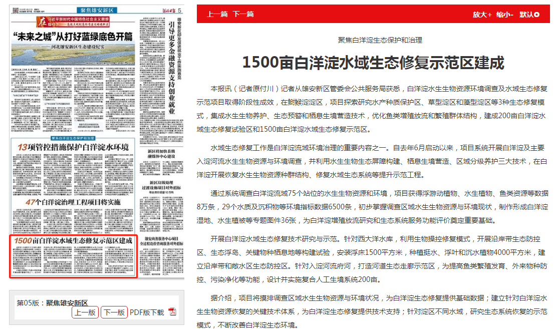 据介绍,项目将摸排调查区域水生生物资源与环境状况,为白洋淀生态修复提供基础数据;建立针对白洋淀水生生物资源恢复的关键技术体系,为白洋淀生态修复提供技术支持;针对淀区不同水域,研究生态系统恢复的示范模式,不断改善白洋淀生态环境。
