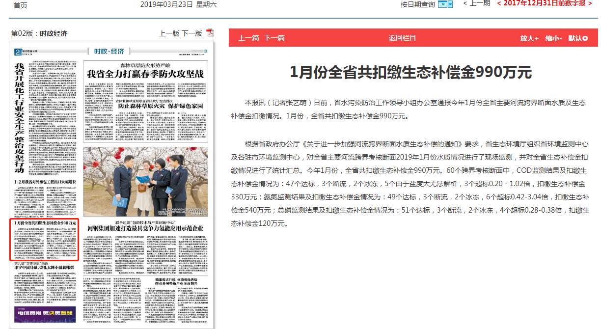 本报讯(记者张艺萌)日前,省水污染防治工作领导小组办公室通报今年1月份全省主要河流跨界断面水质及生态补偿金扣缴情况。1月份,全省共扣缴生态补偿金990万元。