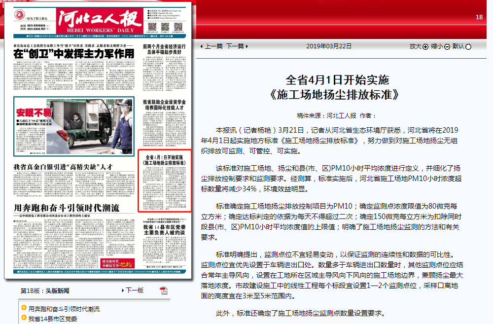 获悉,河北省将在2019年4月1日起实施地方标准《施工场地扬尘排放标准》,努力做到对施工场地扬尘无组织排放可监测、可管控、可实施。 该标准对施工场地、扬尘和县(市、区)PM10小时平均浓度进行定义,并细化了扬尘排放控制要求和监测要求。经测算,标准实施后,河北省施工场地PM10小时浓度超标数量将减少34%,环境效益明显。 标准确定施工场地扬尘排放控制项目为PM10;确定监测点浓度限值为80微克每立方米;确定达标判定的依据为每天不得超过二次;确定150微克每立方米为扣除同时段县(市、区)PM10小时平均浓度值的上限值;明确了施工场地扬尘监测的方法和有关要求。 标准明确提出,监测点位不宜轻易变动,以保证监测的连续性和数据的可比性。监测点位宜优先设置于车辆进出口处。数量多于车辆进出口数量时,其他监测点位应结合常年主导风向,设置在工地所在区域主导风向下风向的施工场地边界,兼顾扬尘最大落地浓度。市政建设施工中的线性工程每个标段宜设置1—2个监测点位,采样口离地面的高度宜在3米至5米范围内。 此外,标准还确定了施工场地扬尘监测点数量设置要求。