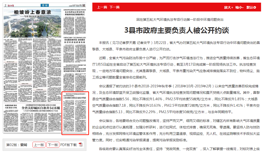 本报讯(见习记者罗天嘉 记者宋平)3月22日,省大气办对第五轮大气环境执法专项行动中环境问题突出的昌黎县、大城县、平泉市政府主要负责人进行公开约谈。
