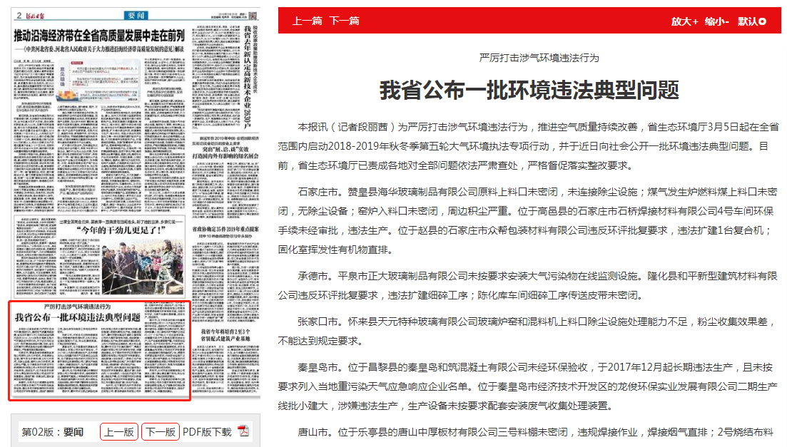 承德市。平泉市正大玻璃制品有限公司未按要求安装大气污染物在线监测设施。隆化县和平新型建筑材料有限公司违反环评批复要求,违法扩建细碎工序;陈化库车间细碎工序传送皮带未密闭。