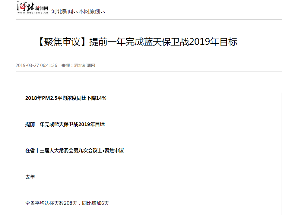 河北新闻网讯(记者周洁)2018年河北环境怎么样?蓝天保卫战打得如何?3月26日,会议听取了省政府副省长时清霜作的关于2018年环境状况和环境保护目标完成情况及秋冬季大气污染综合治理情况的报告。报告显示,2018年我省大气环境持续改善,全省平均达标天数208天,同比增加6天;重度及以上污染天数17天,同比减少12天。全省PM2.5平均浓度56微克/立方米,同比下降14%,提前一年实现《打赢蓝天保卫战三年行动方案》确定的2019年全省PM2.5平均浓度58微克/立方米目标。