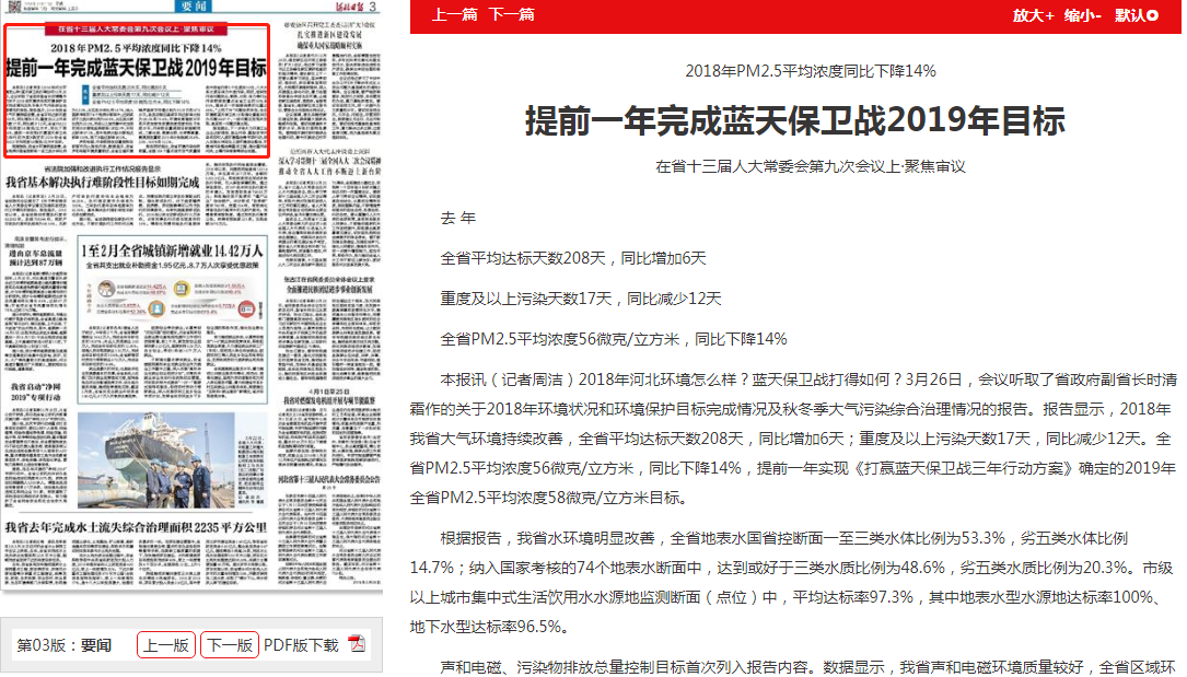 本报讯(记者周洁)2018年河北环境怎么样?蓝天保卫战打得如何?3月26日,会议听取了省政府副省长时清霜作的关于2018年环境状况和环境保护目标完成情况及秋冬季大气污染综合治理情况的报告。报告显示,2018年我省大气环境持续改善,全省平均达标天数208天,同比增加6天;重度及以上污染天数17天,同比减少12天。全省PM2.5平均浓度56微克/立方米,同比下降14%,提前一年实现《打赢蓝天保卫战三年行动方案》确定的2019年全省PM2.5平均浓度58微克/立方米目标。