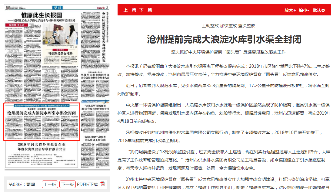 承担整改任务的沧州市供水排水集团有限公司立即行动,制定了专项整改方案,2018年10月底开始施工,2018年底提前完成引水渠全封闭。