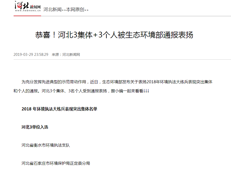 为充分发挥先进典型的示范带动作用,近日,生态环境部发布关于表扬2018年环境执法大练兵表现突出集体和个人的通报。河北3个集体、3名个人受到通报表扬,跟小编一起来看看↓↓↓