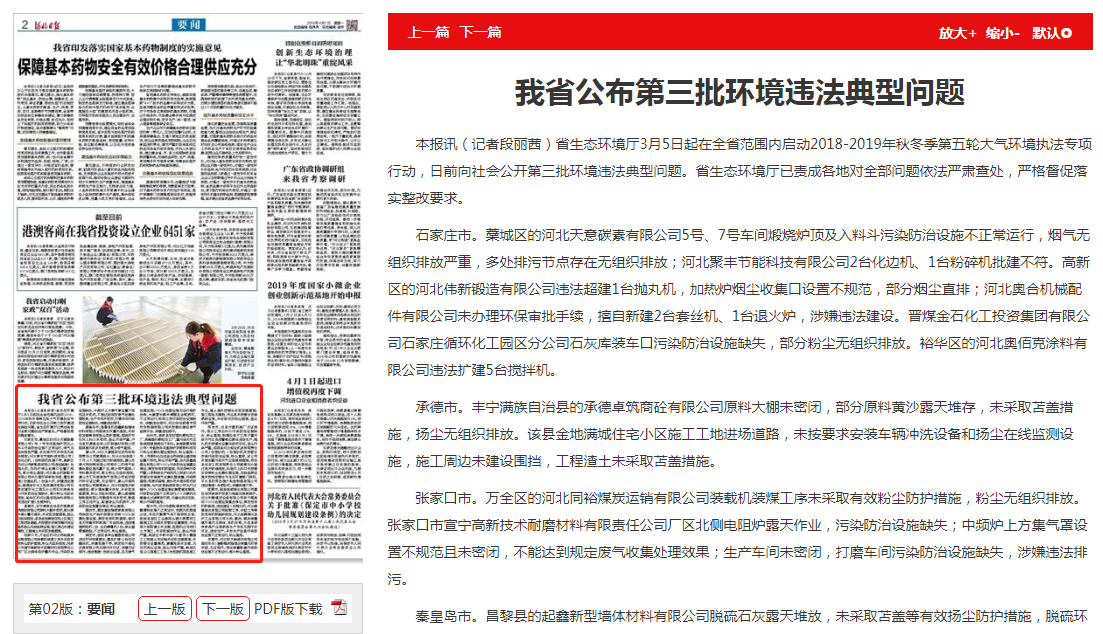 保定市。曲阳县祥业雕塑有限公司违反环评批复要求,擅自扩建12台自动雕刻机,涉嫌批建不符。保定旭兴箱包皮具有限公司无排污许可证,涉嫌无证排污;违法增建1台挤出设备,且无废气治理设施;VOCs治理设施无运行维护台账,光氧管长期未清理且全部损坏,不正常运行;粉碎工序污染防治设施缺失,涉嫌违法排污。河北华运顺通专用汽车制造有限公司未按要求建设废气监测平台,涉嫌违法排污。