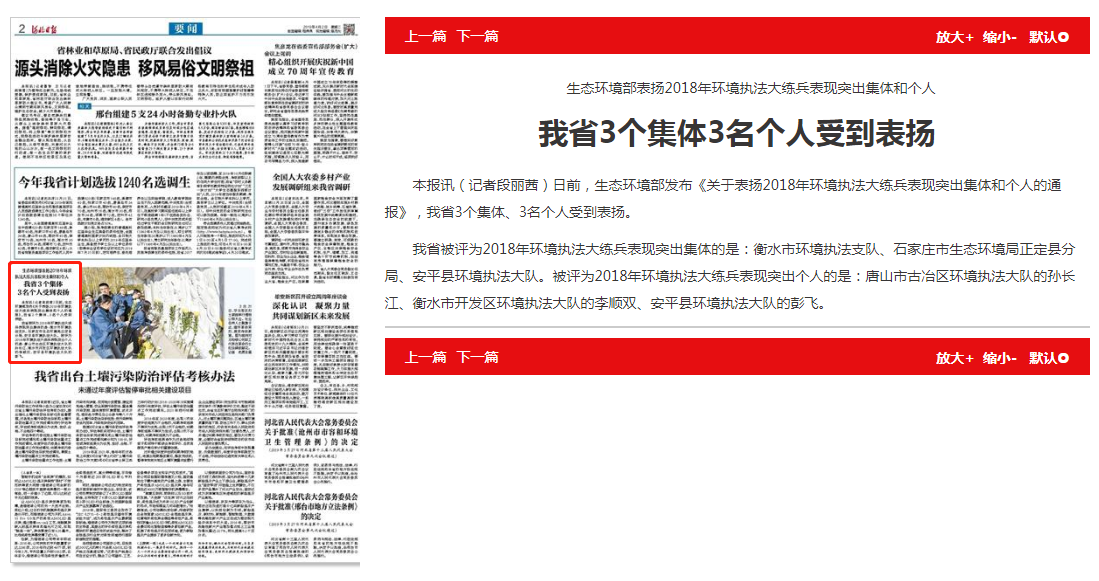 我省被评为2018年环境执法大练兵表现突出集体的是:衡水市环境执法支队、石家庄市生态环境局正定县分局、安平县环境执法大队。被评为2018年环境执法大练兵表现突出个人的是:唐山市古冶区环境执法大队的孙长江、衡水市开发区环境执法大队的李顺双、安平县环境执法大队的彭飞。