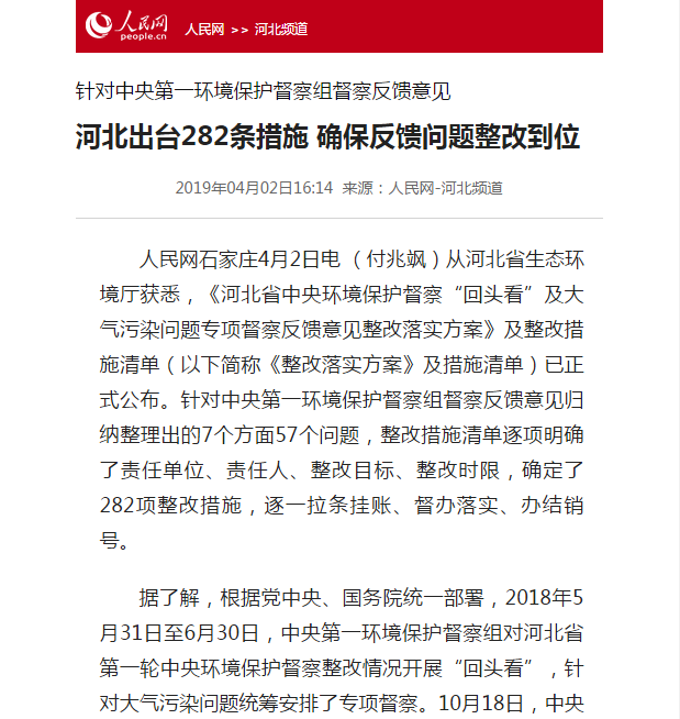 据了解,根据党中央、国务院统一部署,2018年5月31日至6月30日,中央第一环境保护督察组对河北省第一轮中央环境保护督察整改情况开展“回头看”,针对大气污染问题统筹安排了专项督察。10月18日,中央第一环境保护督察组向河北省反馈了督察意见,河北省委、省政府高度重视,成立由省委、省政府主要负责同志担任双组长的督察整改工作领导小组,多次研究部署,迅速组织对中央第一环境保护督察组提出的问题进行梳理,坚持问题导向和目标导向,研究制定了《河北省中央环境保护督察“回头看”及大气污染问题专项督察反馈意见整改落实方案》及整改措施清单(以下简称《整改落实方案》及措施清单)。