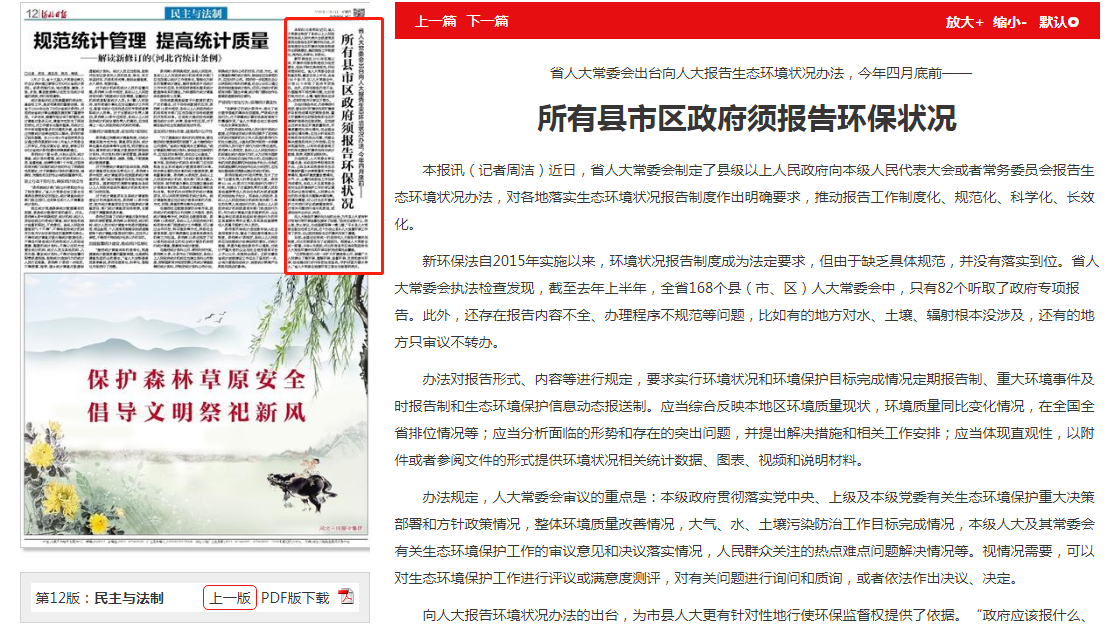 目前,全国还没有统一的政府向人大报告环境状况制度,河北的探索走在了全国前列。根据省人大常委会统一部署,今年4月底前,河北所有县市区将实现政府向人大报告环境状况和环保目标完成情况全覆盖。