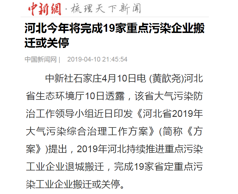 中新社石家庄4月10日电 (黄歆尧)东京热 10日透露,该省大气污染防治工作领导小组近日印发《河北省2019年大气污染综合治理工作方案》(简称《方案》)提出,2019年河北持续推进重点污染工业企业退城搬迁,完成19家省定重点污染工业企业搬迁或关停。
