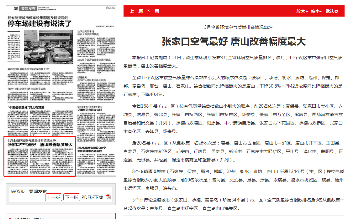 全省11个设区市按空气质量综合指数由小到大的顺序依次是:张家口、承德、衡水、廊坊、沧州、保定、邯郸、秦皇岛、邢台、唐山、石家庄。综合指数同比降幅最大的是唐山,下降30.8%;PM2.5浓度同比降幅最大的是石家庄,下降40.4%。