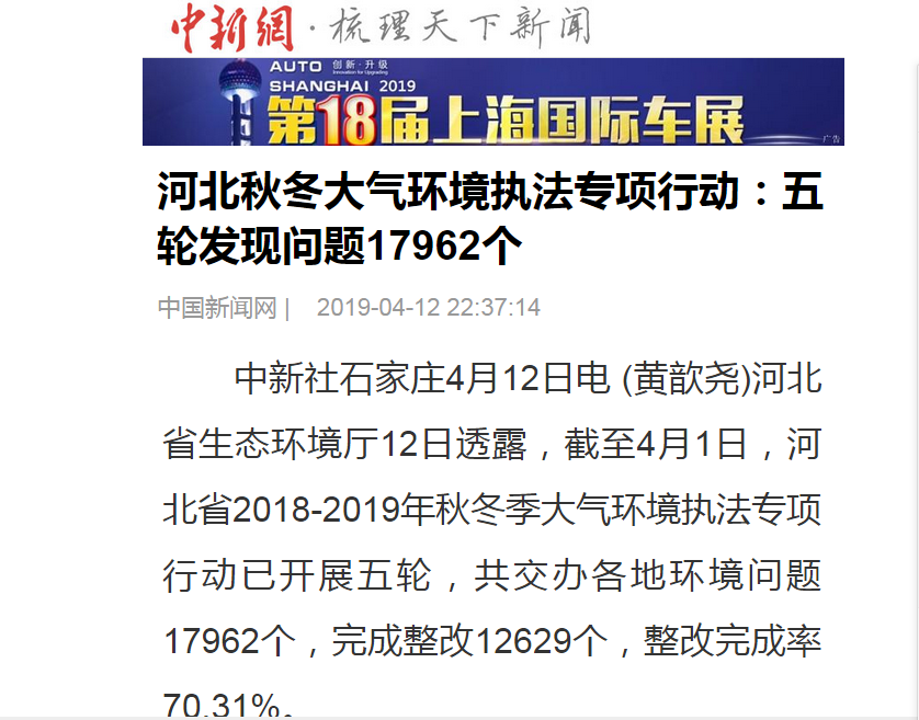 12日透露,截至4月1日,河北省2018-2019年秋冬季大气环境执法专项行动已开展五轮,共交办各地环境问题17962个,完成整改12629个,整改完成率70.31%。