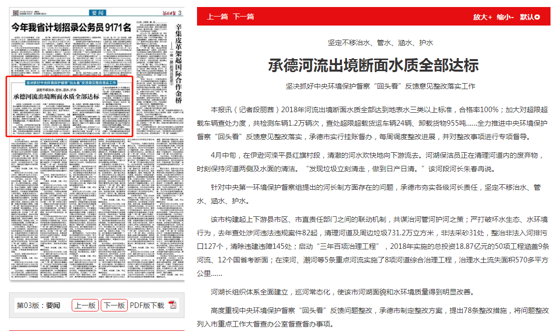 针对中央第一环境保护督察组提出的河长制方面存在的问题,承德市夯实各级河长责任,坚定不移治水、管水、涵水、护水。