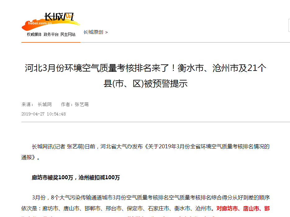 长城网讯(记者 张艺萌)日前,河北省大气办发布《关于2019年3月份全省环境空气质量考核排名情况的通报》。