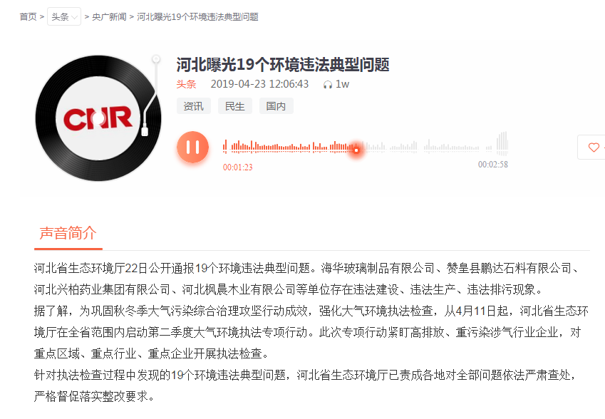 中国之声《央广新闻》:河北省第二季度大气环境执法专项行动公开曝光第二批27个环境违法典型问题(4.30)