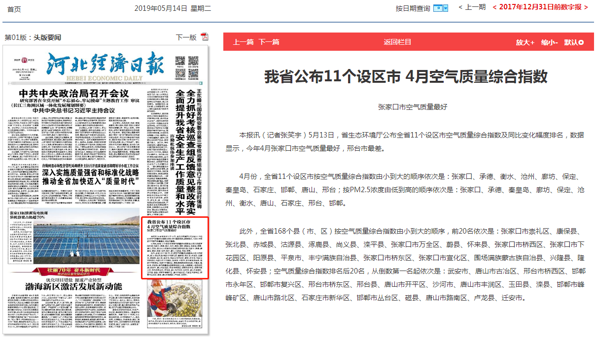 4月份,全省11个设区市按空气质量综合指数由小到大的顺序依次是:张家口、承德、衡水、沧州、廊坊、保定、秦皇岛、石家庄、邯郸、唐山、邢台;按PM2.5浓度由低到高的顺序依次是:张家口、承德、秦皇岛、廊坊、保定、沧州、衡水、唐山、石家庄、邢台、邯郸。