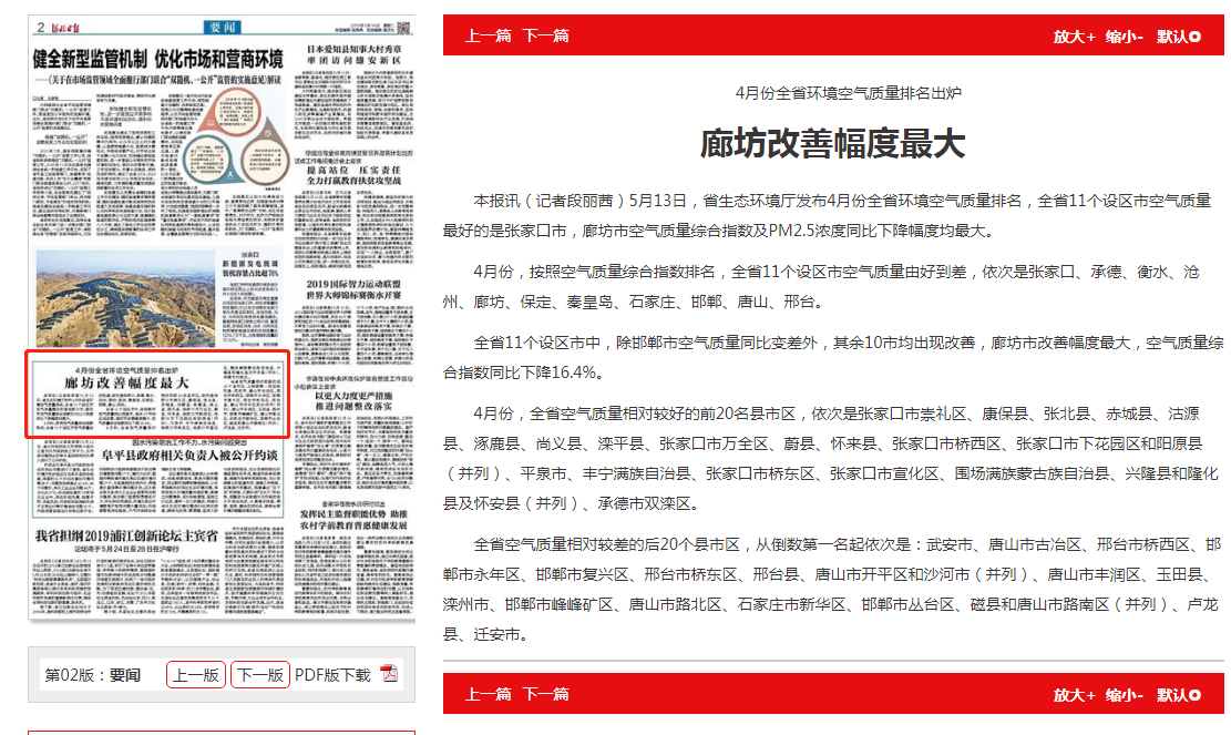 4月份,按照空气质量综合指数排名,全省11个设区市空气质量由好到差,依次是张家口、承德、衡水、沧州、廊坊、保定、秦皇岛、石家庄、邯郸、唐山、邢台。
