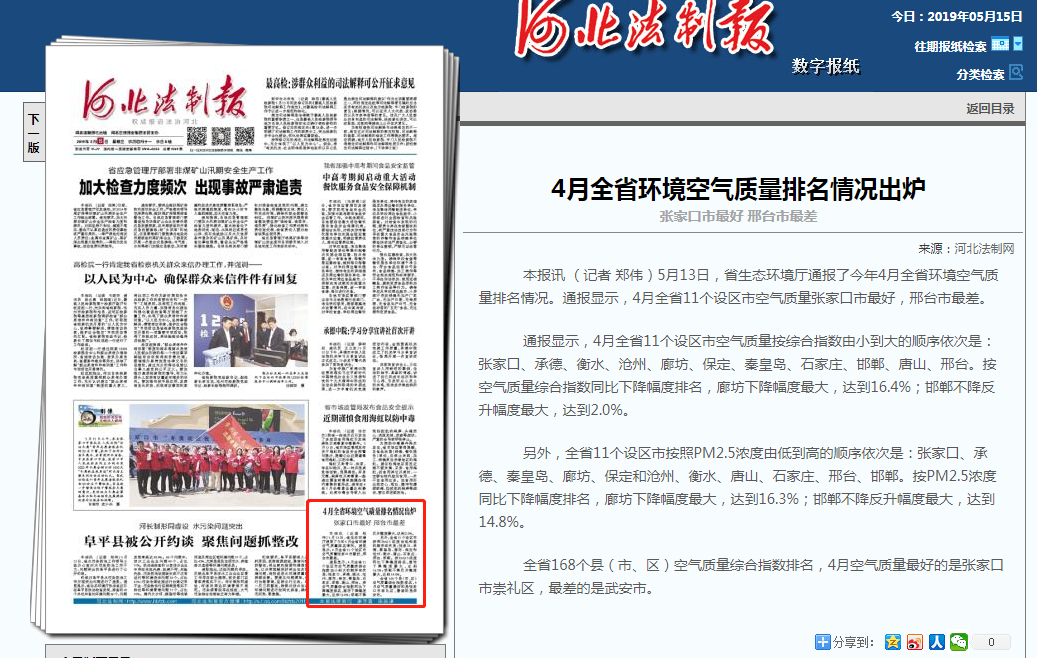 通报了今年4月全省环境空气质量排名情况。通报显示,4月全省11个设区市空气质量张家口市最好,邢台市最差。