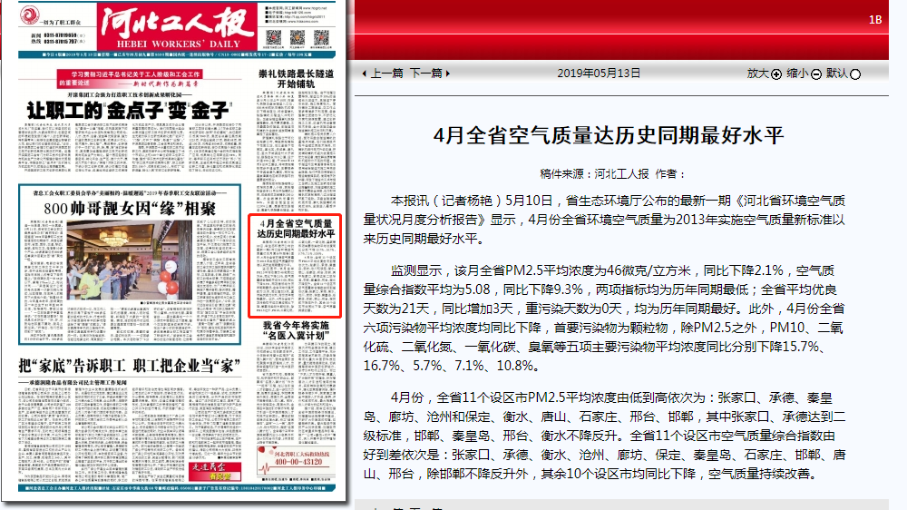 公布的最新一期《河北省环境空气质量状况月度分析报告》显示,4月份全省环境空气质量为2013年实施空气质量新标准以来历史同期最好水平。