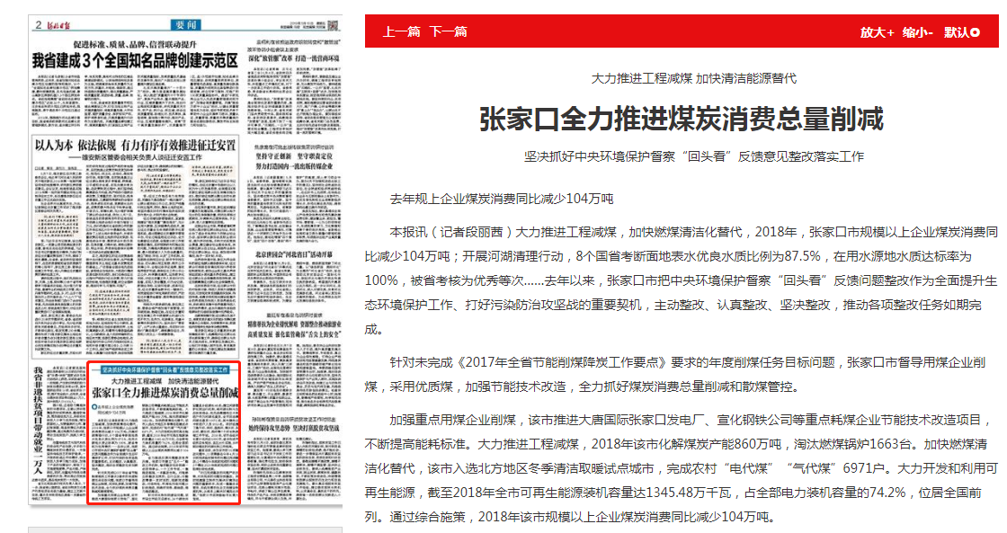 本报讯(记者段丽茜)大力推进工程减煤,加快燃煤清洁化替代,2018年,张家口市规模以上企业煤炭消费同比减少104万吨;开展河湖清理行动,8个国省考断面地表水优良水质比例为87.5%,在用水源地水质达标率为100%,被省考核为优秀等次……去年以来,张家口市把中央环境保护督察“回头看”反馈问题整改作为全面提升生态环境保护工作、打好污染防治攻坚战的重要契机,主动整改、认真整改、坚决整改,推动各项整改任务如期完成。