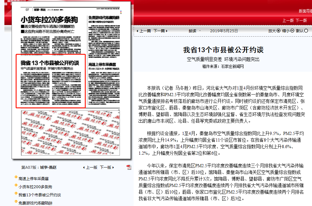 执法检查发现问题突出的唐山市丰润区、沧县、任县等党委或政府主要负责人。 根据约谈会通报,1至4月,秦皇岛市空气质量综合指数同比上升9.5%,PM2.5平均浓度同比上升14.9%,上升幅度均居全省11个设区市首位。在我省8个大气污染传输通道城市中,廊坊市1至4月PM2.5平均浓度、空气质量综合指数同比分别上升8.6%、1.2%,上升幅度分别居全省第2位和第6位。 今年以来,保定市清苑区PM2.5平均浓度改善幅度连续三个月排我省大气污染传输通道城市所辖县(市、区)后10位,馆陶县、秦皇岛市山海关区空气质量综合指数或PM2.5平均浓度同比不降反升累计3次,馆陶县、博野县、望都县、廊坊市广阳区空气质量综合指数或PM2.5平均浓度改善幅度连续两个月排我省大气污染传输通道城市所辖县(市、区)后10位,蔚县、张家口市宣化区PM2.5平均浓度改善幅度连续两个月排名我省非大气污染传输通道城市所辖县(市、区)后3位。 2018-2019年秋冬季以来,生态环境部打赢蓝天保卫战强化监督中,交办唐山市丰润区环境问题23个,扬尘污染等问题较突出;交办沧县环境问题223个,占沧州市问题数量的23.8%,问题数在全省各县(市、区)中排第1位;交办任县环境问题56个,问题数在邢台市各县(市、区)中排第3位,尤其是4月份第22轮强化监督中问题最突出,被发现环境问题20个,在邢台市各县(市、区)中排第1位,在全省各县(市、区)中排第5位。 会议要求,各地要对辖区内开展拉网式、体检式排查,建立全面的问题清单、责任清单、整改清单和效果清单,立行立改,边查边改,挂账督办,办结销号。
