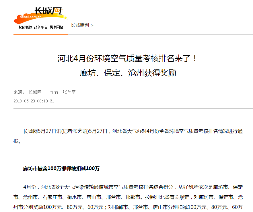 长城网5月27日讯(记者张艺萌)5月27日,河北省大气办对4月份全省环境空气质量考核排名情况进行通报。