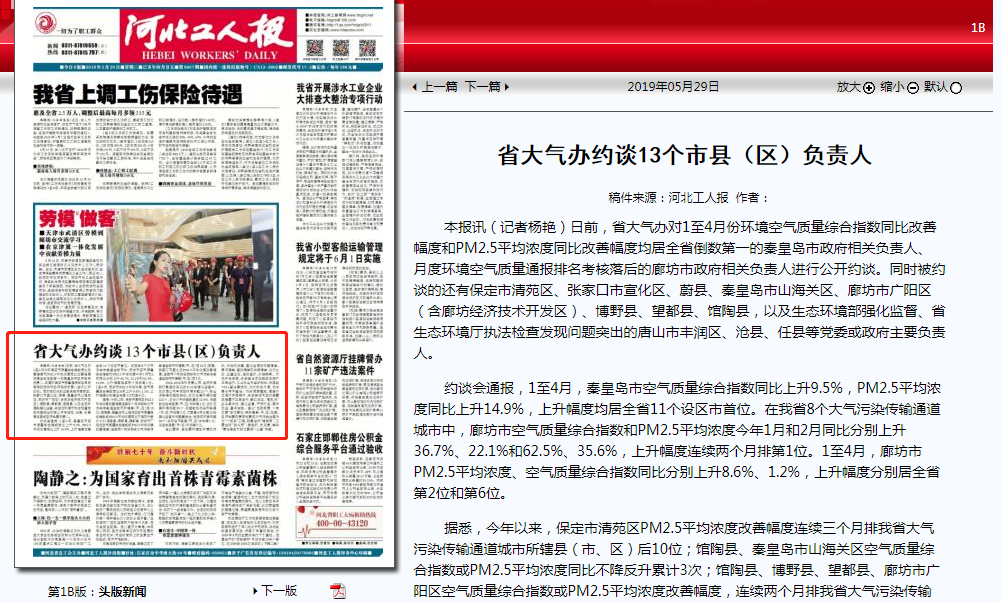 本报讯(记者杨艳)日前,省大气办对1至4月份环境空气质量综合指数同比改善幅度和PM2.5平均浓度同比改善幅度均居全省倒数第一的秦皇岛市政府相关负责人、月度环境空气质量通报排名考核落后的廊坊市政府相关负责人进行公开约谈。同时被约谈的还有保定市清苑区、张家口市宣化区、蔚县、秦皇岛市山海关区、廊坊市广阳区(含廊坊经济技术开发区)、博野县、望都县、馆陶县,以及生态环境部强化监督、东京热