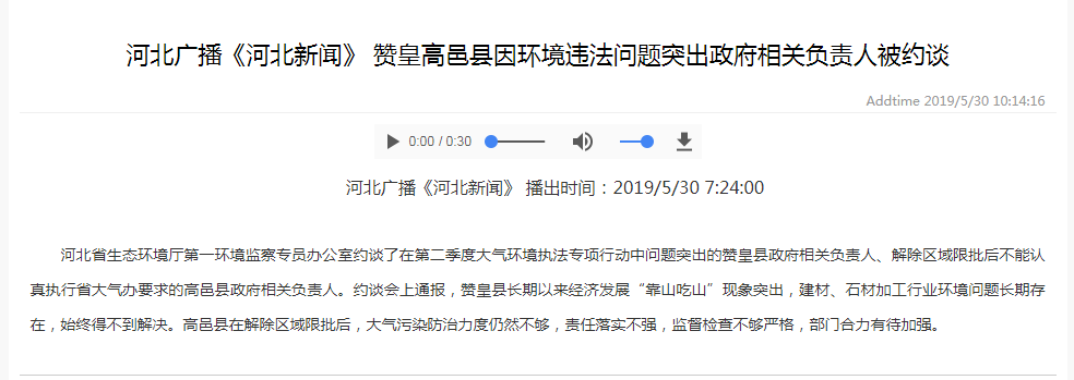 河北综合广播《河北新闻》:赞皇高邑县因环境违法问题突出政府相关负责人被约谈